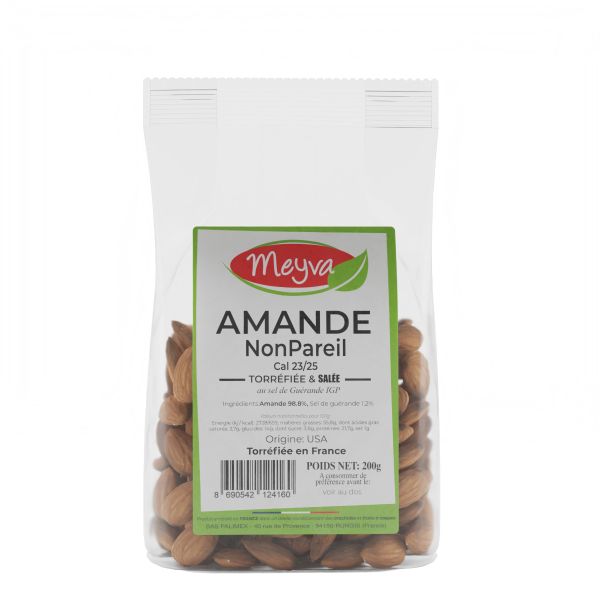 Amandes torréfiées salée sachet 200g. Cal. 23/25.