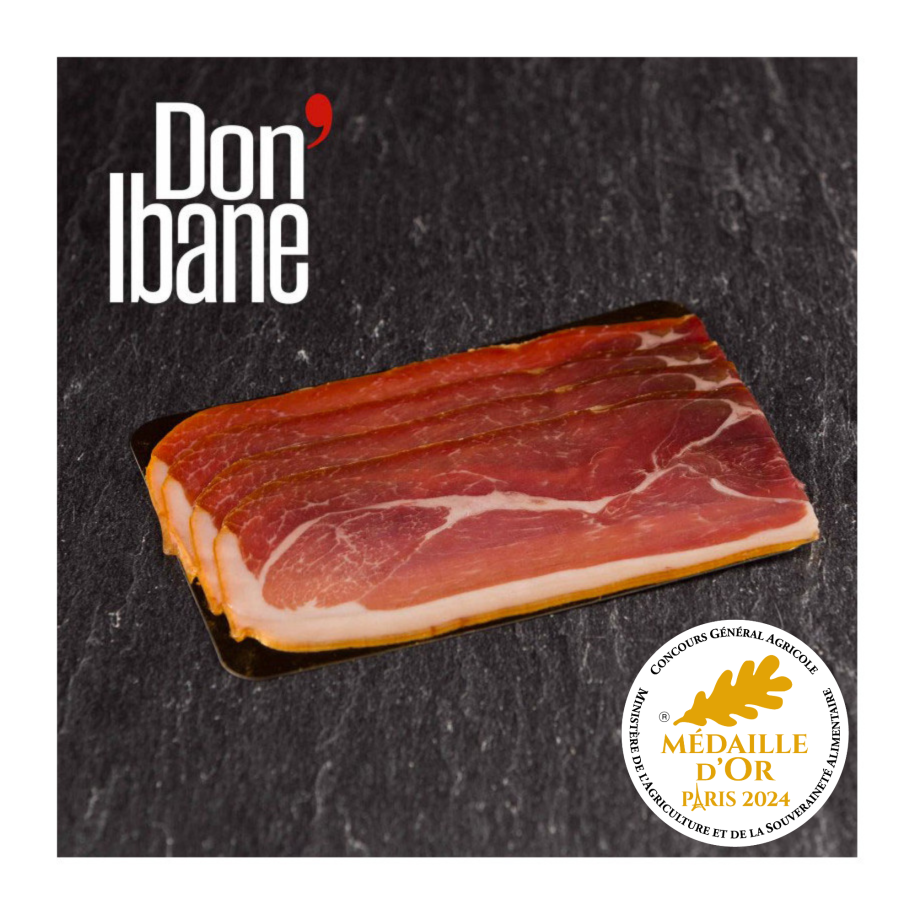 Le jambon Don'Ibane est un jambon sec d'exception affiné 20 à 24 mois. Persillé, fondant et du caractère en fin de bouche, c'est un vrai plaisir gustatif.