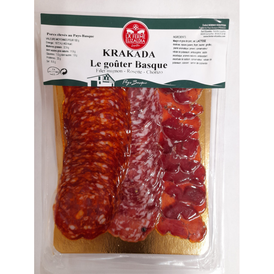 Découvrez cet assortiment d'environ 150g, composé de filet mignon séché, saucisson et chorizo. 18 tranches sous vide 150g. Origine France Pays Basque.