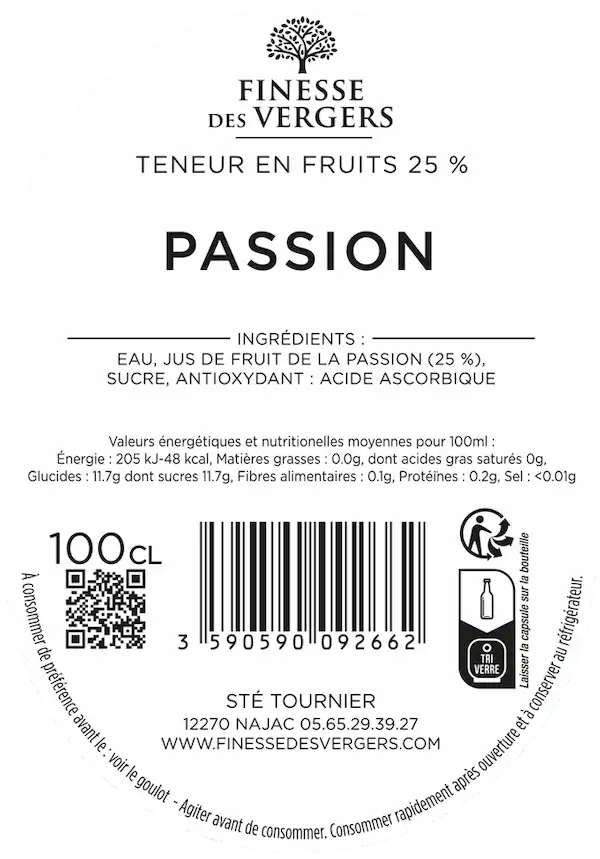 Eau, jus de fruit de la passion (25%), sucre, Antioxidant : Acide Ascorbique.
