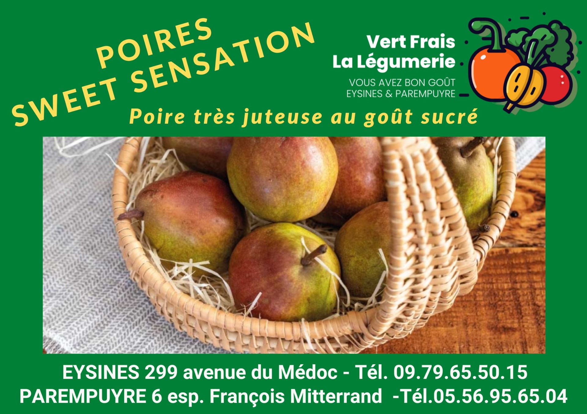 Poire variété Sweet sensation. Cat. 1. Calibre 75/80 mm - Origine France.